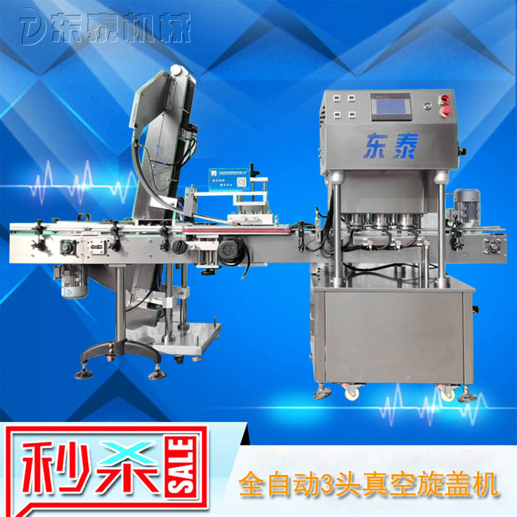 該直線式真空旋蓋機(jī)是東泰機(jī)械結(jié)合用戶使用的情況,摒棄了傳統(tǒng)轉(zhuǎn)盤式真空旋蓋機(jī)的弊端,研制開發(fā)的新型高效設(shè)備,設(shè)備自動(dòng)檢測到兩個(gè)瓶子蓋子進(jìn)入到雙頭真空旋蓋機(jī)內(nèi),旋蓋機(jī)彩色顯示屏?xí)?shí)時(shí)顯現(xiàn)旋蓋狀況,整機(jī)多點(diǎn)檢測,當(dāng)進(jìn)口無瓶無蓋、出口堵塞、定位不準(zhǔn)、瓶身傾倒均自動(dòng)停機(jī)。單個(gè)旋蓋頭達(dá)到的真空度都可以單顯示,單調(diào)整