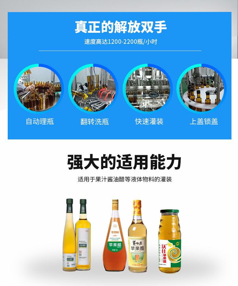 該系列果醋灌裝機(jī)采用伺服柱塞式計(jì)量灌裝原理,多項(xiàng)專利認(rèn)證,適用于各種規(guī)格(0.1-1升可兼顧到2升灌裝)的液體灌裝。