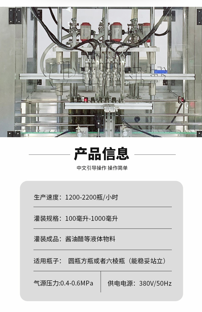 1、該灌裝機(jī)可完成不同瓶型的自動(dòng)定量、自動(dòng)灌裝、自動(dòng)出瓶,專業(yè)灌裝各種液體及粘流體,采用防滴漏與拉絲的灌裝悶頭、防高泡產(chǎn)品的灌裝升降系統(tǒng)、確保瓶口定位的定位系統(tǒng)和液位控制系統(tǒng);