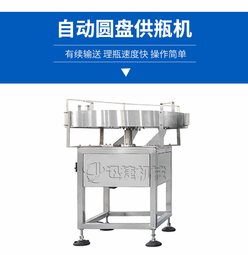 該圓盤供瓶機(jī)理瓶機(jī)是由人工將瓶子放入圓形轉(zhuǎn)盤上,轉(zhuǎn)盤轉(zhuǎn)動(dòng)將瓶子有續(xù)撥入輸送帶,進(jìn)入灌裝機(jī)進(jìn)行灌裝。使用方便,噪音小,理瓶速度快,操作簡(jiǎn)單是不可缺少的一個(gè)環(huán)節(jié)。