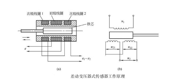 差動變壓器式位移傳感器是一種電磁互感變換器件,它將被測量(位移、壓力、振動等) 的變化轉(zhuǎn)換成互感系數(shù) 的變化,再轉(zhuǎn)換成次線圈的電壓信號輸出。其結(jié)構(gòu)如下圖 所示,在線圈骨架上裝有—個初線圈和兩個次線圈,中間插有一個可移動的鐵芯,兩個次線圈的導(dǎo)線直徑、匝數(shù)、繞法和結(jié)構(gòu)尺寸都相同。當(dāng)在初線圈中輸人適當(dāng)頻率的電壓激勵時,則在兩個次線圈中將產(chǎn)生感應(yīng)電動勢。兩個次線圈的輸出電壓分別為 21 和 22 (空載時則為感應(yīng)電動勢 21 和 22),由于兩個次線圈采用反向串聯(lián) ( 即將同名端串聯(lián)在—起)。